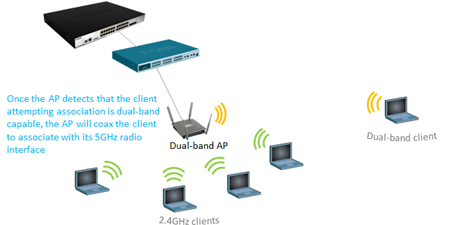 Band steering is a technology that detects whether or not the wireless client is dual-band capable, and if it is, it will push the client to connect to the less congested 5GHz network. It does this by actively blocking the client’s attempts to associate with the 2.4GHz network. Since both 802.11n and the latest 802.11ac standards support 5GHz band, band steering can ensure that they achieve their maximum performance without being bottlenecked by legacy 802.11b/g clients. This way, you can make the most of the latest technology and at the same time ensure backwards compatibility with existing legacy equipment.