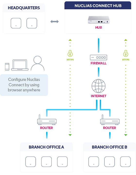 Da die Nuclias Connect Software transparent im Netzwerk läuft, kann ein AP in einer NAT-Umgebung überall bereitgestellt werden. Darüber hinaus können Administratoren eine Vielzahl von verteilten Installationen bewältigen und verwalten. Dazu gehört auch Möglichkeit, jeweils spezifische Einstellungen und Administratorkonten zu konfigurieren.