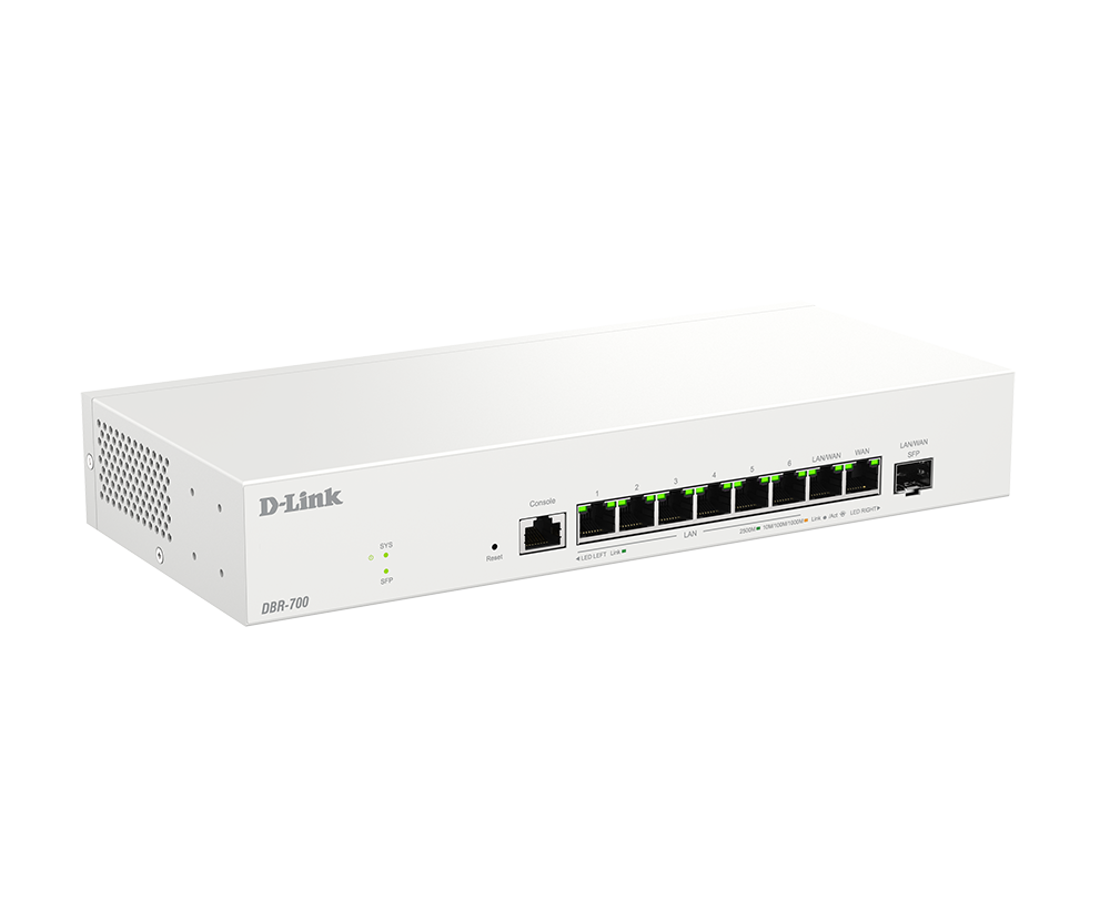 Le DBR-700 est un routeur professionnel hautes performances doté d’interfaces 2,5G, y compris des ports SFP, offrant une connectivité câblée flexible et stable, en particulier pour la transmission longue distance. La fonctionnalité Multi-WAN garantit des services réseau ininterrompus en passant automatiquement à une connexion WAN de secours et à un accès Internet à partage de charge. Grâce à un pare-feu puissant et à la prise en charge des tunnels VPN IPsec, votre accès à distance est toujours sécurisé et chiffré. La gestion améliorée des points d’accès simplifie le contrôle centralisé de plusieurs points d’accès, ce qui fait du DBR-700 un excellent choix pour les entreprises à la recherche d’un réseau fiable, sécurisé et haut débit.