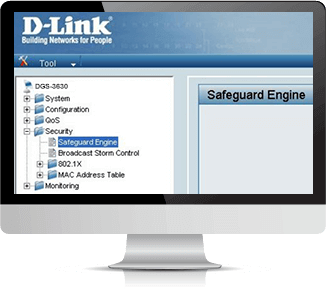Pour améliorer la fiabilité, la disponibilité et la maintenance, les switches DGS-3630 sont équipés du moteur Safeguard Engine de D-Link, qui prévient les surcharges de trafic malveillant causées par des attaques de vers ou de virus.