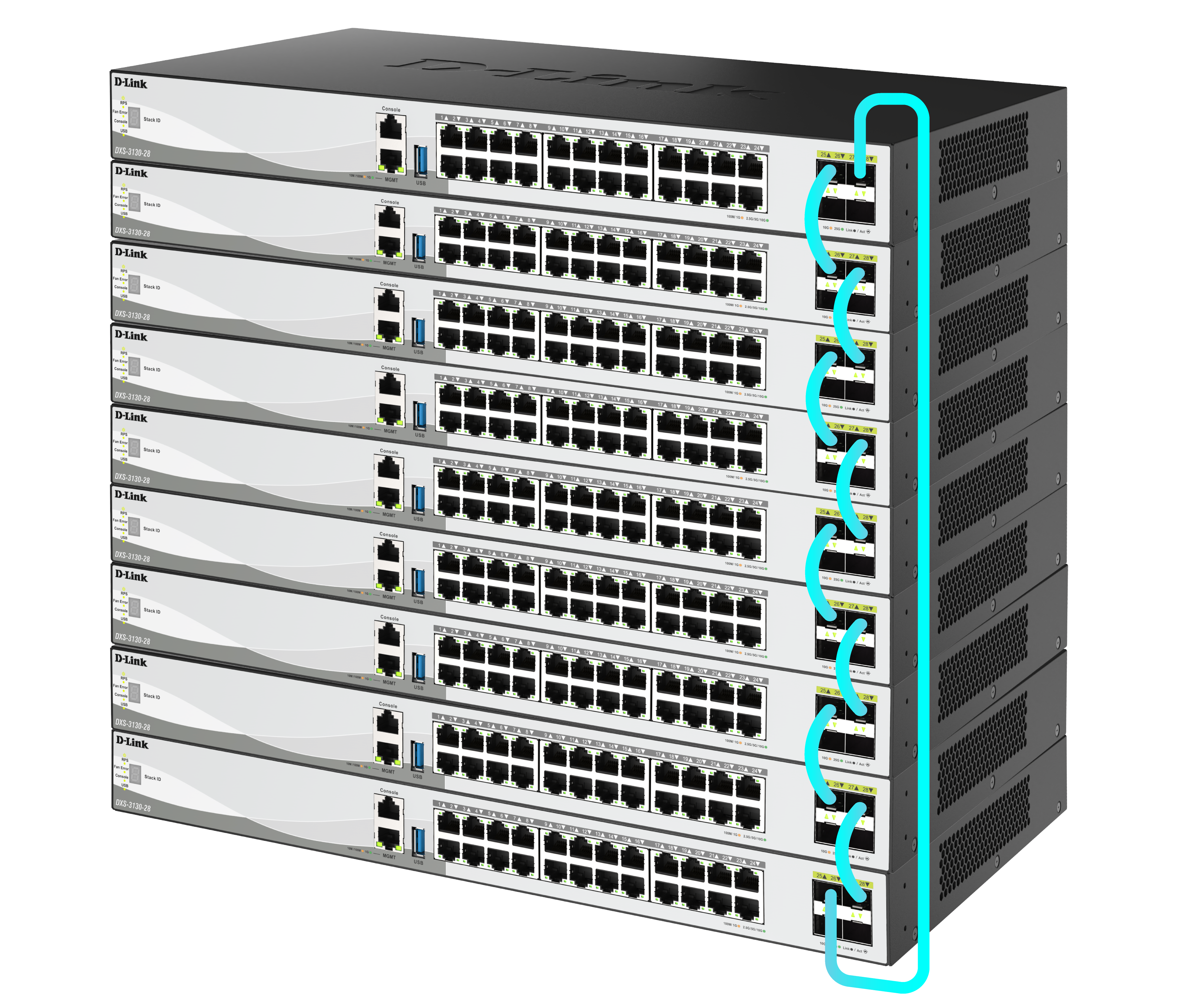 Scale your network with the DXS-3130-28 by stacking up to 9 switches into a single physical or virtual unit. This simplifies management, improves redundancy, and allows control of the entire stack through one IP address. With up to 200 Gbps, physical stacking boosts capacity to meet growing network demands.