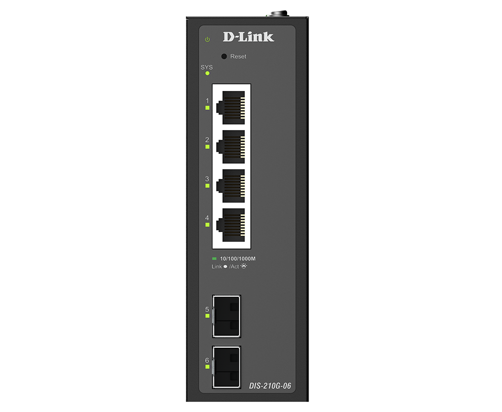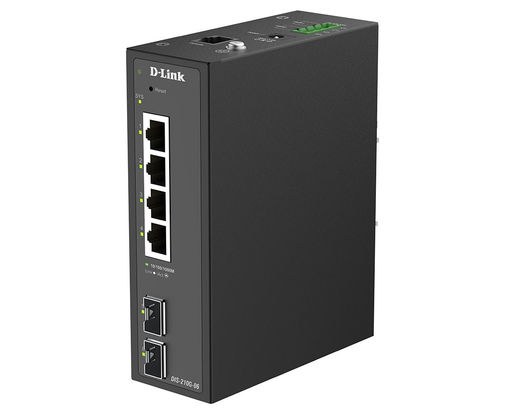 The DIS-210G-06 is an industrial smart switch equipped with four 1G ports and two 1G SFP ports for network management and aggregation. The SFP ports support long-distance data transmission, rapid failover redundancy, and throughput aggregation. The DIS-210G-06 supports ERPS and static routing, which reduces latency, enables effective traffic control, and improves network scalability and efficiency.