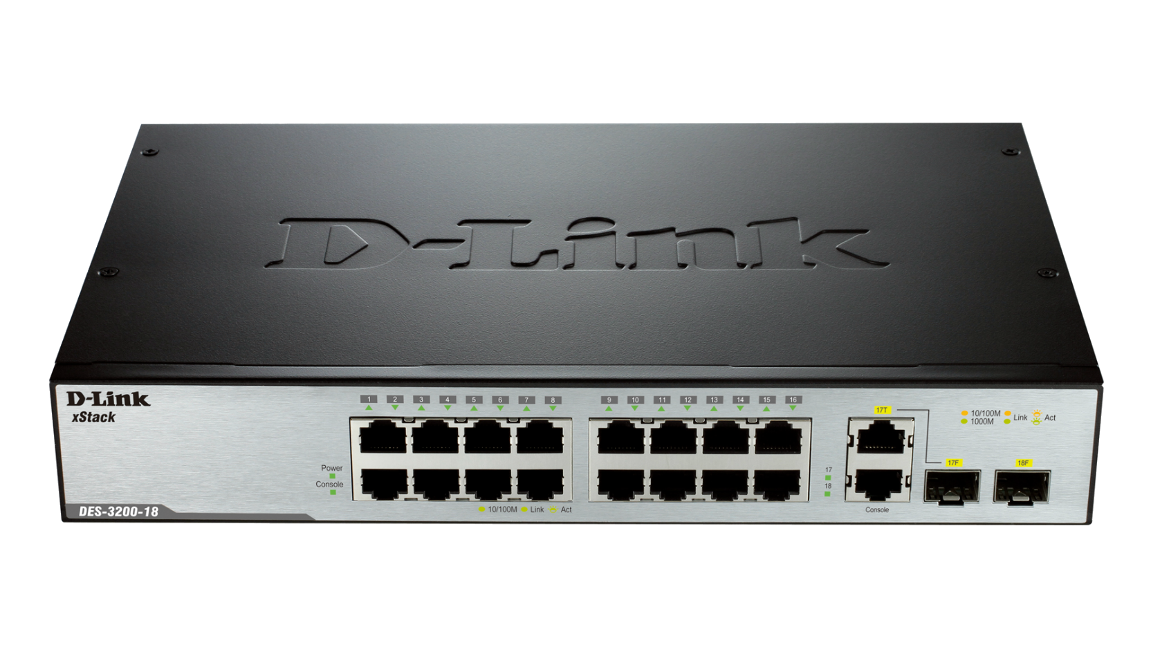 • DES-3200-18: 16-Port Fast Ethernet L2 Managed Switch with 1 x SFP and 1 x Combo 1000BASE-T/SFP ports (fanless)