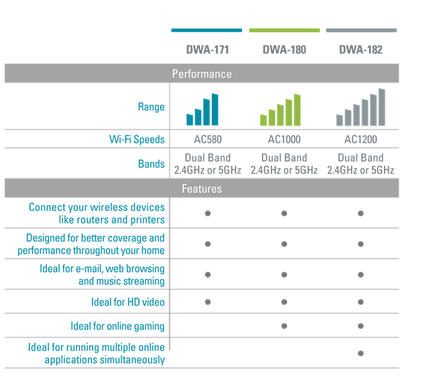By upgrading your laptop and desktop computers to Wireless AC, you can immediately enjoy the benefits of faster wireless speeds and better connectivity. Delivering Wi-Fi dual band speeds to your laptop or desktop computer, the DWA-171 is the perfect solution for those looking to enjoy smooth HD video streaming, fast file transfers and lag-free video chatting – all with less wireless interference for maximum performance.