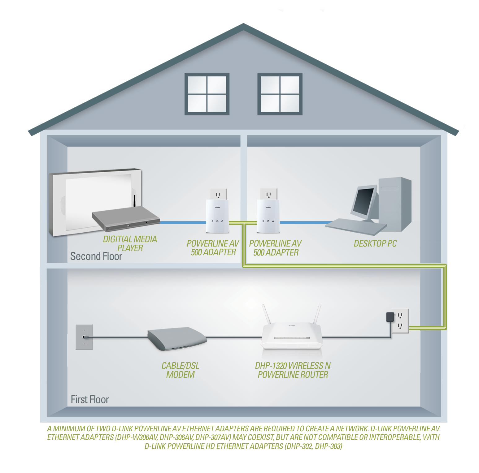 The D-Link PowerLine AV 500 Adapter Starter Kit comes with 2 PowerLine AV 500 Adapters (DHP-500AV). The PowerLine AV 500 Adapter (DHP-500AV) turns any electrical outlet into a home network connection to provide fast, reliable speeds of up to 500Mbps¹ to any room in your house. Since it is compliant with the HomePlug AV standard, you can use it to extend an existing PowerLine network², or simply create a new one. It turns every power outlet into a possible network connection so you can access digital media devices, game consoles, print servers, computers and network storage devices from any room in your home. Simply connect one adapter to an existing power outlet², connect it to your home network router, and plug another adapter to any other room in your house to get instant shared network connections.