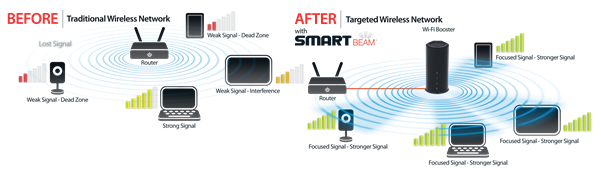 Build a wireless home network capable of delivering the bandwidth to handle HD video streams, large media file downloads, and online gaming to multiple devices, simultaneously. SmartBeam uses 6 multi-directional antennas to find and track individual devices, then focus beams of bandwidth to those devices, ensuring a seamless connection anywhere in the home. Ideal for large homes or small offices where concrete walls, successive floors in multi-storied buildings, or other architectural impediments can weaken a wireless signal, SmartBeam is designed to handle large home networks and can even power devices across large backyards. What’s more, this tracks mobile devices in real-time so the Whole Home Router 1000 supllies this boosted bandwidth to your iPad or or smartphones as you move around. Eliminate wireless dead spots and unleash comprehensive whole-home coverage on all your devices, all at once – the Whole Home Router 1000 provides uninterrupted connectivity to any device, anywhere in your home or small office.