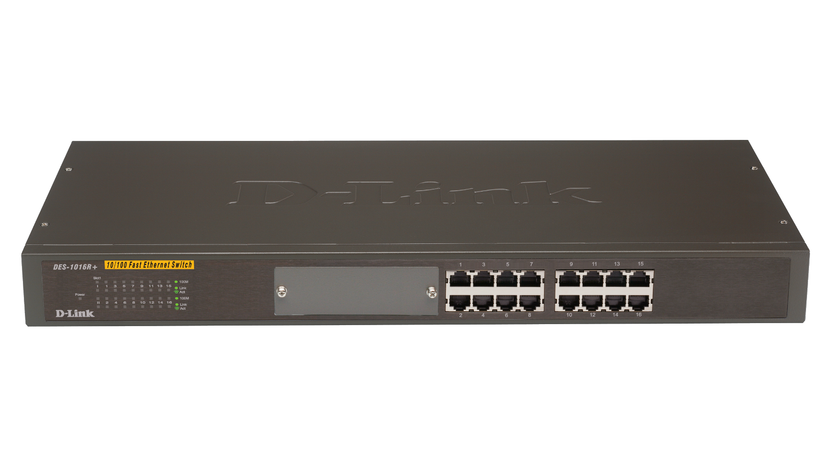 DES-1016R+ 16-Port Fast Ethernet Unmanaged Switch With Open Slot is designed to enhance workgroup performance while providing a high level of flexibility. Powerful yet easy to use, the DES-1016R+ allows users to simply plug any port to either a 10Mbps or 100Mbps network to multiply bandwidths, boost response time and satisfy heavy load demands.