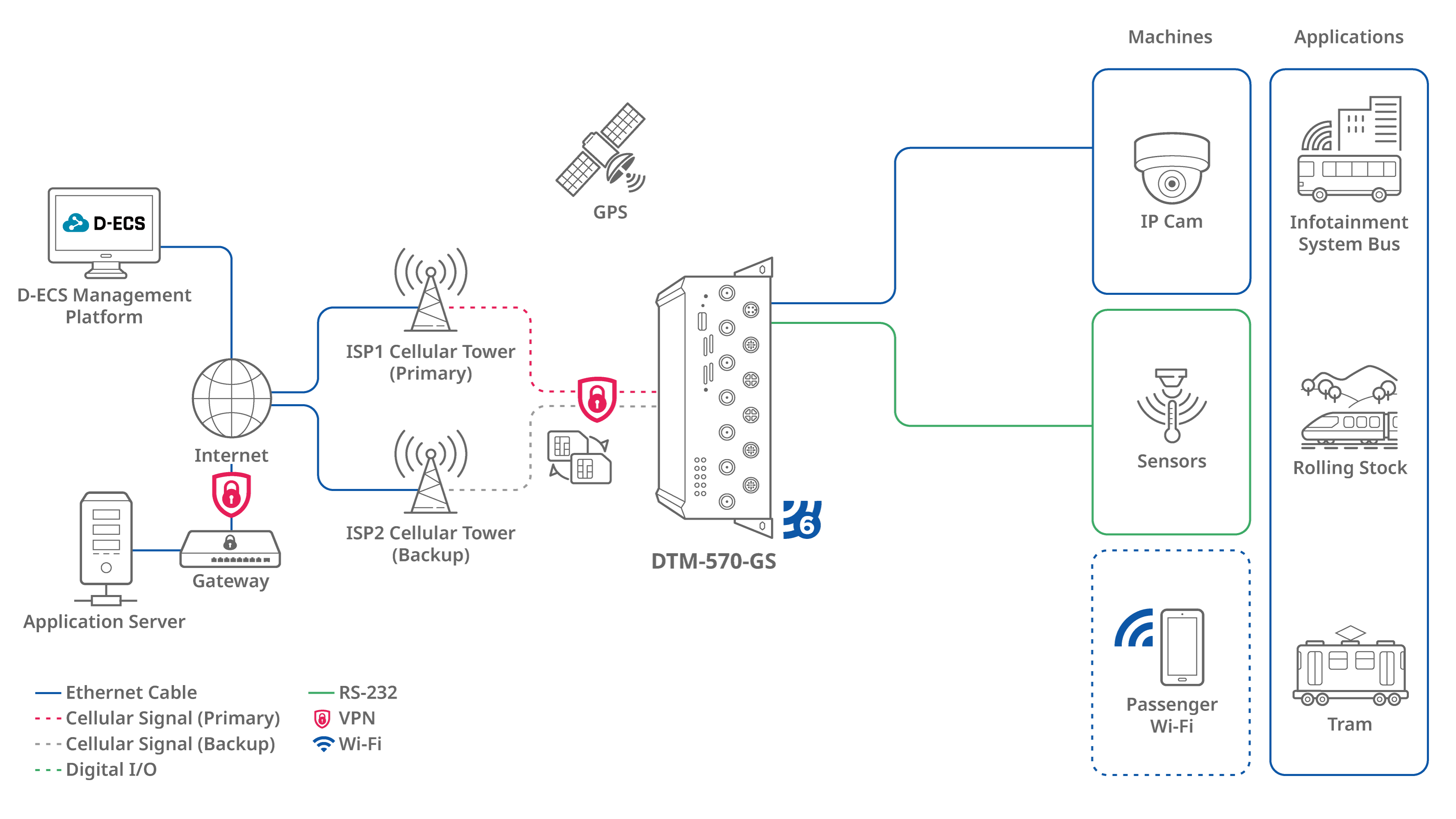 The DTM-570-GS 5G Transit Gateway empowers rail transport with advanced connectivity, linking onboard RS232 and Ethernet devices to the Internet via a robust 5G network. This setup not only facilitates real-time monitoring for passenger safety through surveillance systems but also ensures seamless operation of railway onboard systems. Additionally, it delivers precise station arrival notifications on the digital signage, enhancing the rail passenger experience.