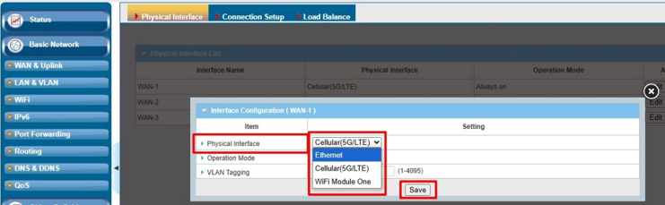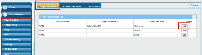 Go to Basic Network > WAN & Uplink > Physical Interface tab
