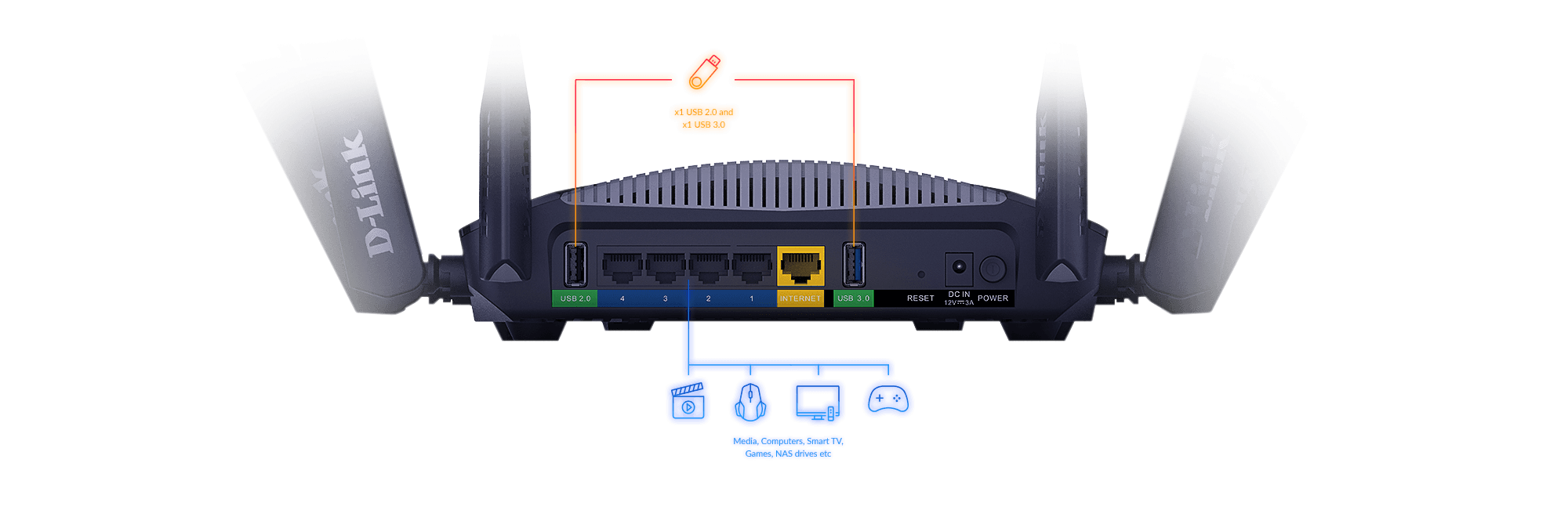 Share photos, videos, and music on your home Wi-Fi. Connect devices like printers to the USB 2.0 port at the back of the router, and utilise the superspeeds of the USB 3.0 port on the front to access USB Storage, cameras, or other higher-bandwidth devices.