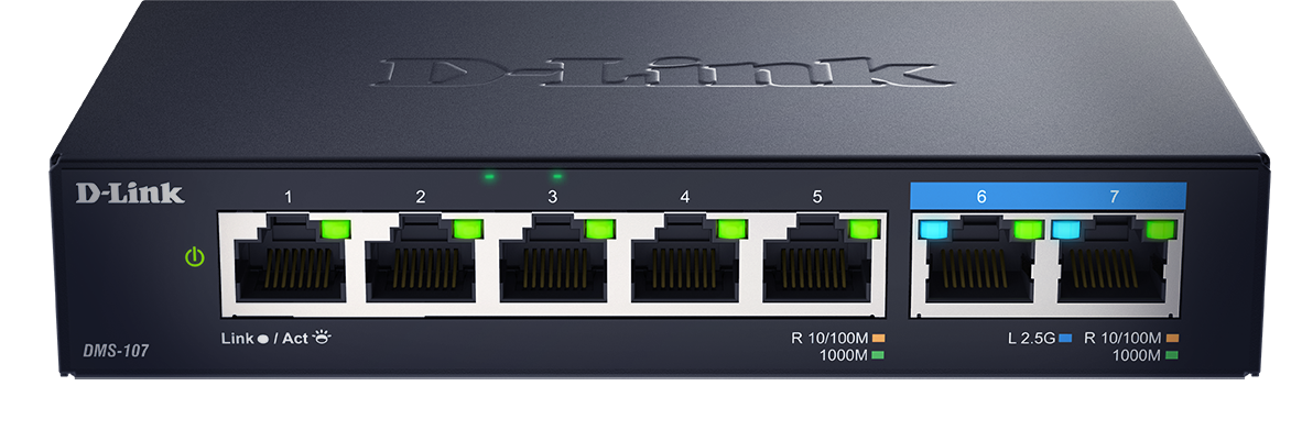 The DMS-107 is a multi-Gigabit Ethernet plug-and-play switch that provides ultra-fast connectivity to your network core or network-attached storage (NAS) device. You can easily connect multiple computers within minutes, and start sharing an internet connection, files, music, and video across your small office or home network.