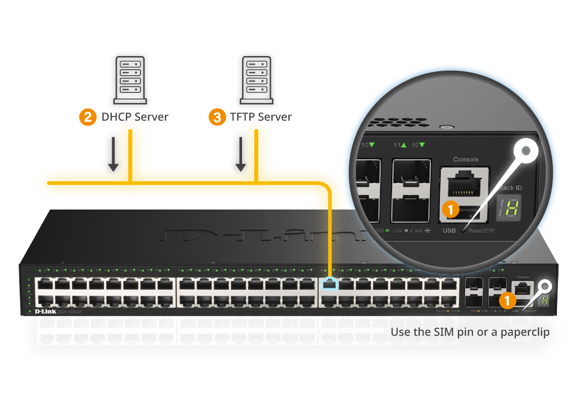 Le ZTP (Zero-Touch Provisioning) simplifie la configuration en permettant aux appareils de se configurer automatiquement, sans intervention manuelle. Il suffit de maintenir le bouton de réinitialisation enfoncé pendant 5 à 10 secondes pour déclencher le redémarrage et le processus de provisionnement.Le ZTP accélère le déploiement, réduit les erreurs et garantit une configuration cohérente — idéal pour les réseaux de grande envergure.