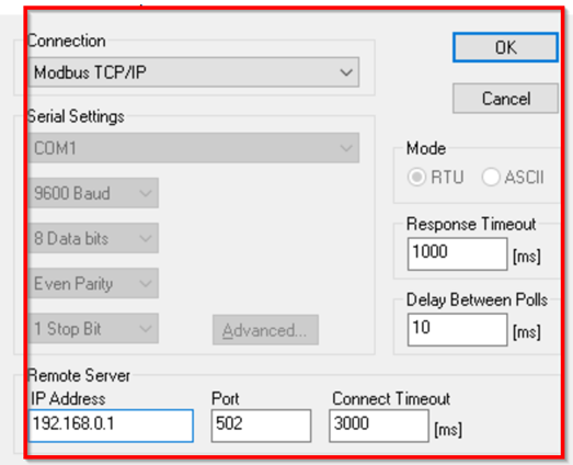 We take the DOM-530-TSO and the Modbus Poll tool as an example to conduct the following test. On the DOM-530-TSO, we set the IP and port on Modbus Poll.