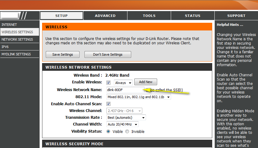 Step 2: Click on the Setup tab on the top of the configuration page and then click the Wireless Settings button on the left side.
