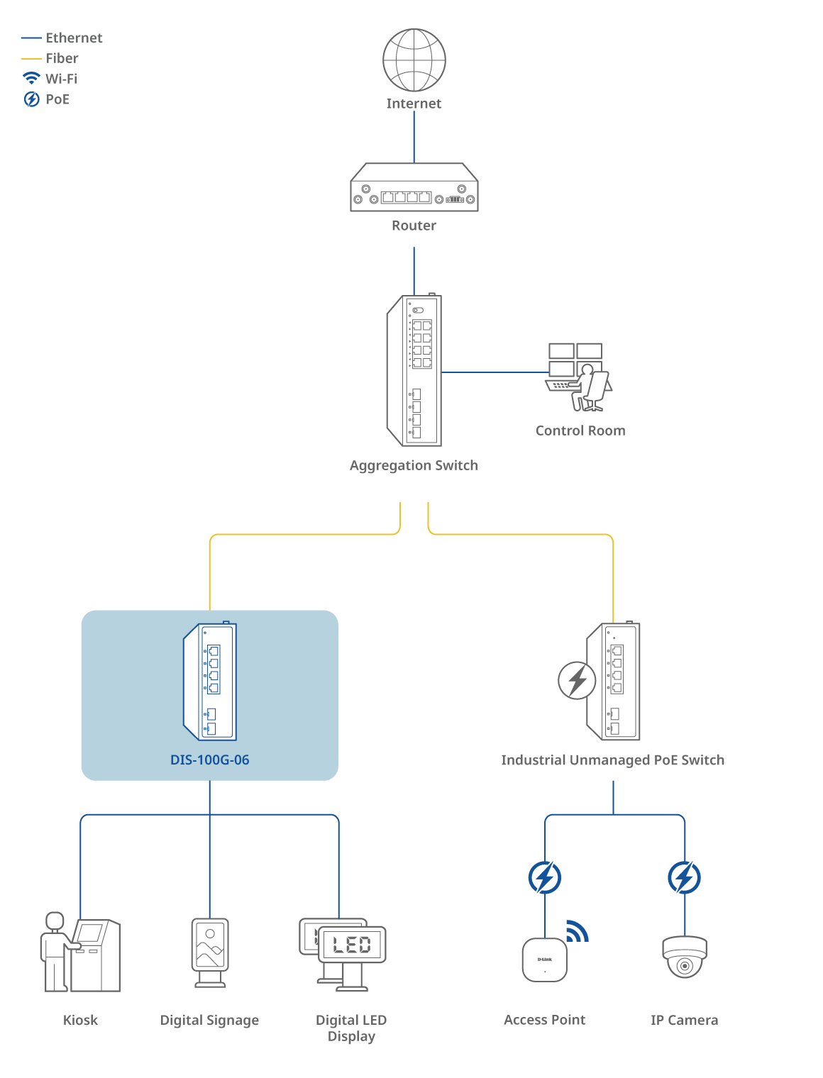 The DIS-100G-06 features two SFP ports that enable flexible, long-distance fiber connections, perfect for extending your network across remote sites or between buildings. Fiber optic cabling goes beyond the distance limitations of traditional Ethernet, offering high bandwidth and strong resistance to interference. This ensures stable, high-performance transmission in industrial environments where reliability is essential.