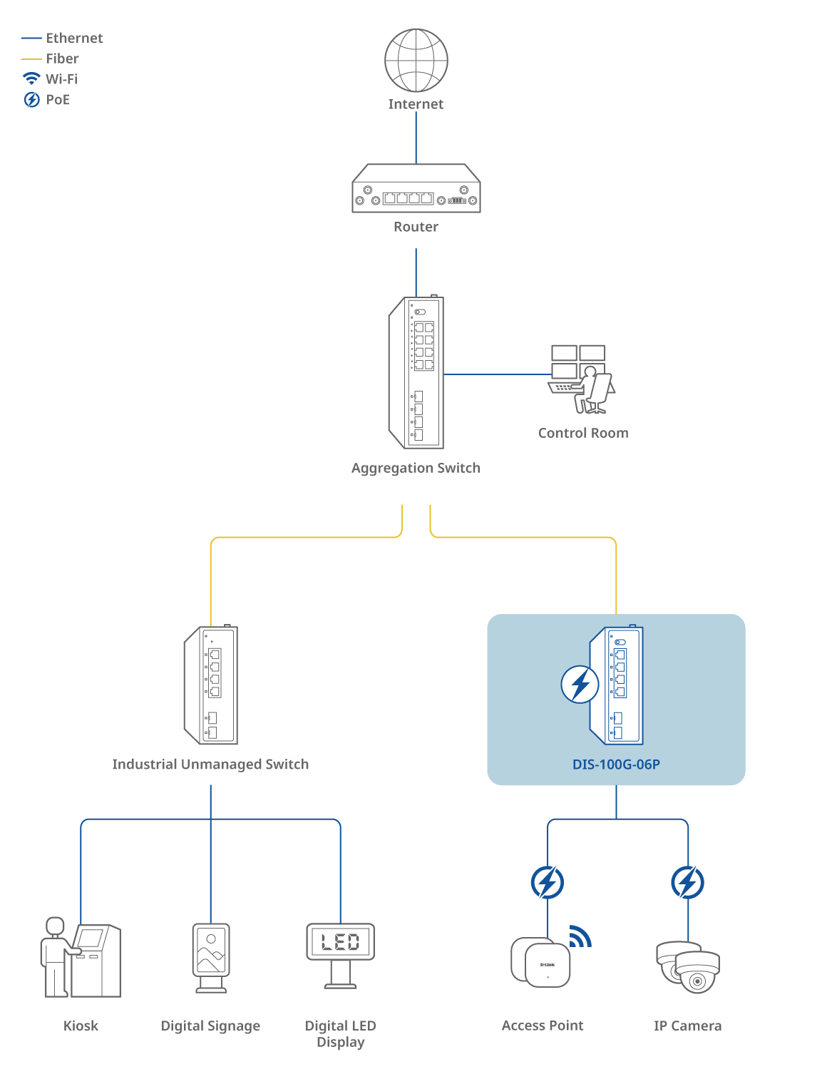 The DIS-100G-06P features four built-in PoE ports that comply with IEEE 802.3af/at standards, delivering both data and power over a single Ethernet cable. With a total power budget of up to 120W, each port can supply up to 30W, making it a great fit for powering devices such as surveillance cameras, IP phones, wireless access points, and IoT sensors. This simplifies installation, enables flexible device placement, and reduces the need for additional electrical infrastructure.
