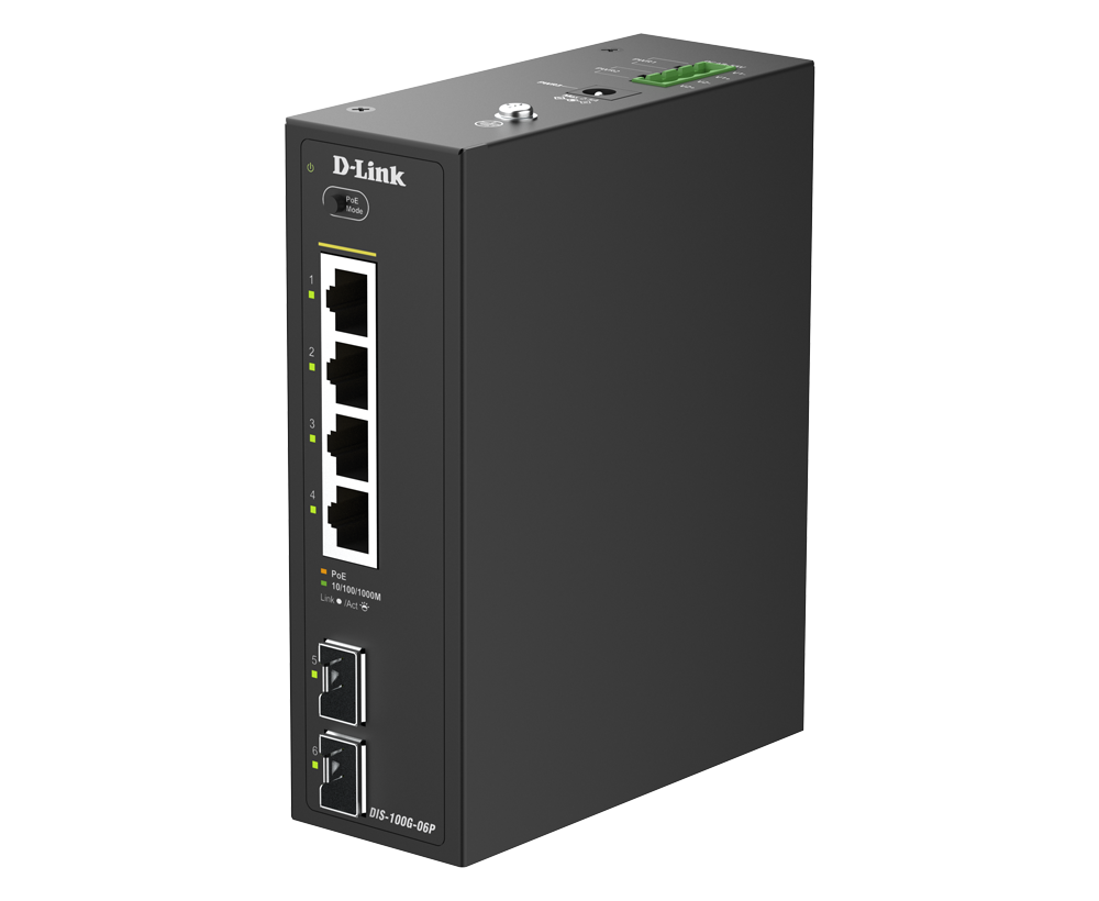 The DIS-100G-06P is an industrial unmanaged switch equipped with four 1G PoE ports and two SFP ports, providing plug-and-play simplicity deployment. The SFP ports support long-range data transmission, removing the distance limitations of traditional Ethernet cabling. With reliable, high-performance operation, it's well-suited for edge deployments in applications like HD surveillance, wireless access points and more.