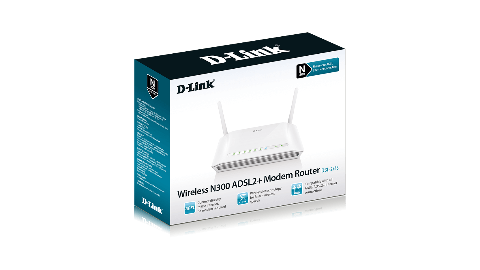 The DSL-2745 Wireless N300 ADSL2+ Modem Router is a versatile, high-performance router for a home or small office. With integrated ADSL2/2+, supporting download speeds up to 24 Mbps, firewall protection, Quality of Service (QoS), 802.11n wireless LAN, and 4 Ethernet switch ports, the DSL-2745 provides all the functions that a user needs to establish a secure and high-speed link to the Internet.