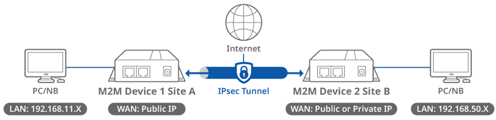 This topology diagram illustrates an IPsec VPN scenario. A D-Link M2M device at Site A has a public IP address on its WAN interface, while another D-Link M2M device at Site B has either a public or private IP address on its WAN interface. Once an IPsec tunnel is established between the two sites, the LAN subnet at Site A and Site B can communicate with each other. The packets transmitted through the IPsec tunnel are encapsulated and encrypted.