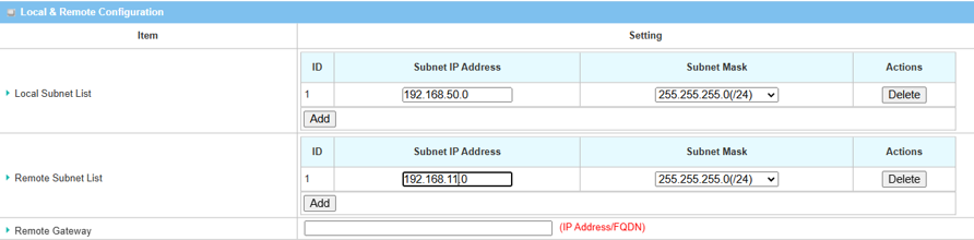 | Remote Subnet List | Specify the Remote subnet IP address: 192.168.50.0 and Subnet Mask: 255.55.55.0(/24) based on this scenario |