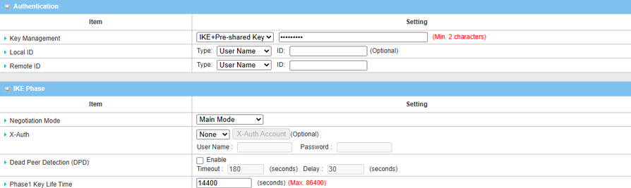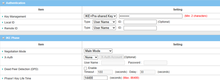 Select IKE+Pre-shared Key from the drop-down menu, and fill in the pre-shared key Please note that the pre-share key must match for both device 1 and 2 |