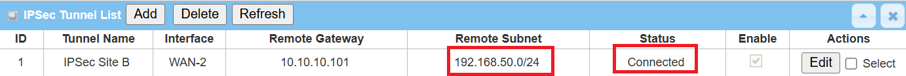 The Status of IPsec Tunnel List displays "Connected" for Site B Device 2.