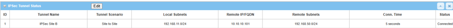 The Status of IPsec Tunnel List displays "Connected" for Site A Device 1.