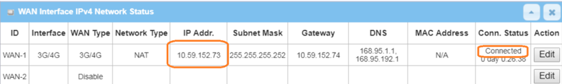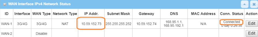 1. Before IPsec configuration, check the WAN interface status and make sure the M2M router/gateway WAN interface has already obtained a public IP address.