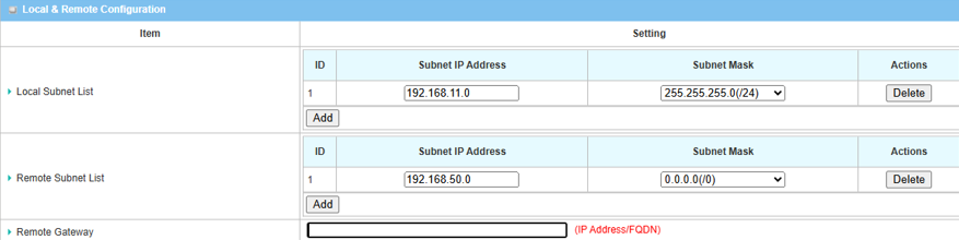 | Local Subnet List | Specify the local subnet IP address: 192.168.11.0 and Subnet Mask: 255.55.55.0(/24) based on this scenario |