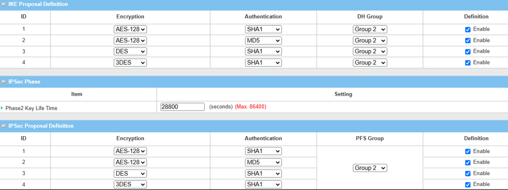 Leave the Enable default setting on Web UI Encryption: AES-128 / DES / 3DES Authentication: SHA1 / MD5 PFS Group: Group2 |