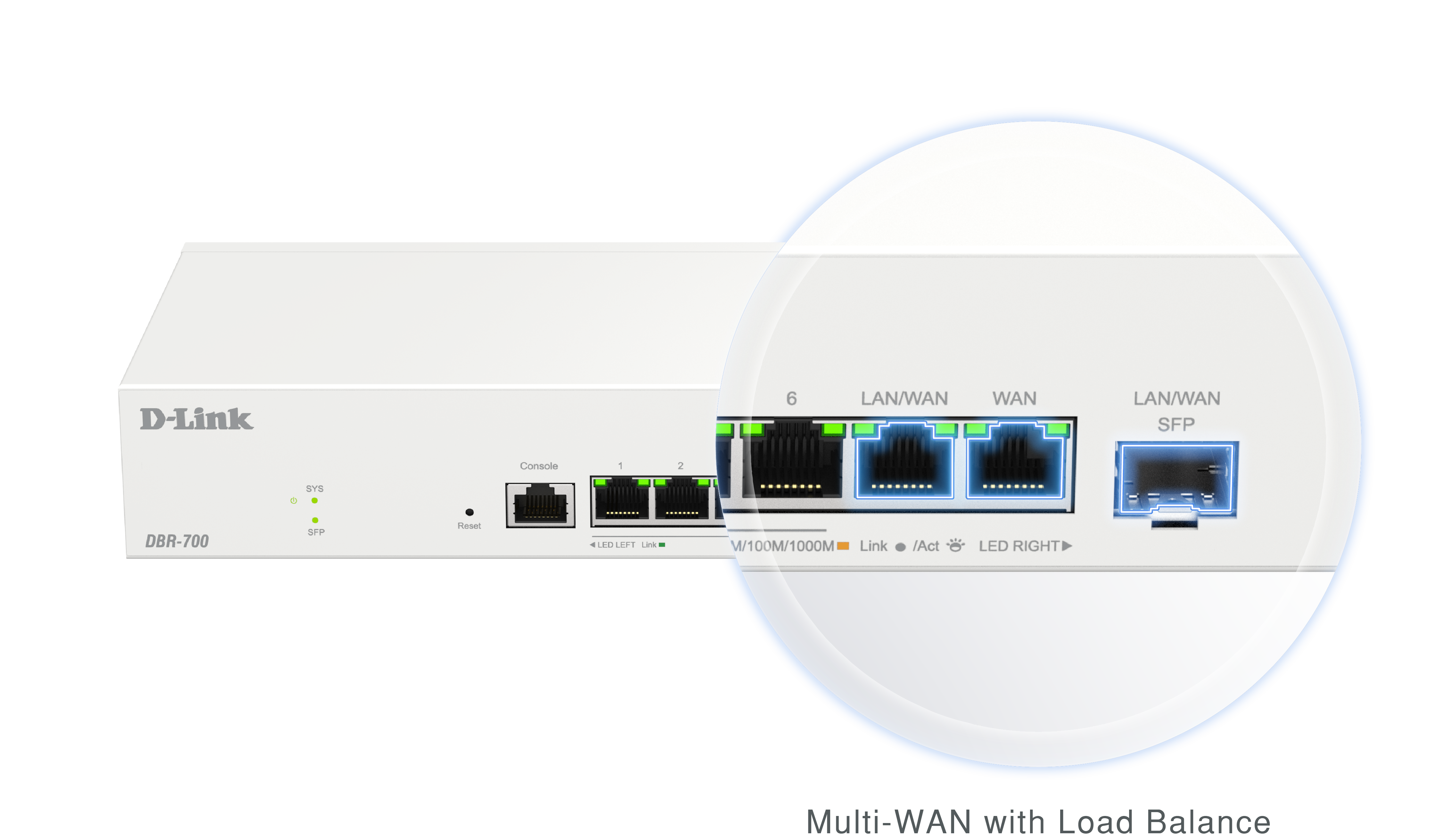 With up to 3 WAN ports, the DBR-700 keeps your business always connected. Load balancing distributes network traffic across multiple WAN connections, preventing any single connection from being overwhelmed, averaging overall internet usage, and ensuring continuity with backup connections in case of failures.