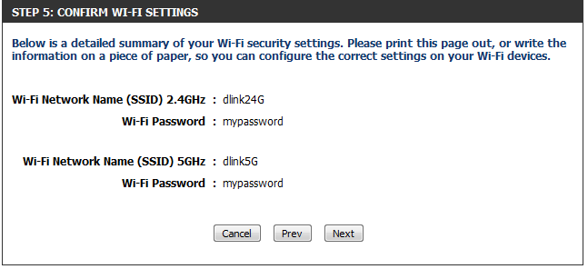 A confirmation window will appear to signify the completion of the setup wizard. A summary of your wireless network settings will also be displayed. It is recommended that you make a record of this information for future reference. Click Next to continue.
