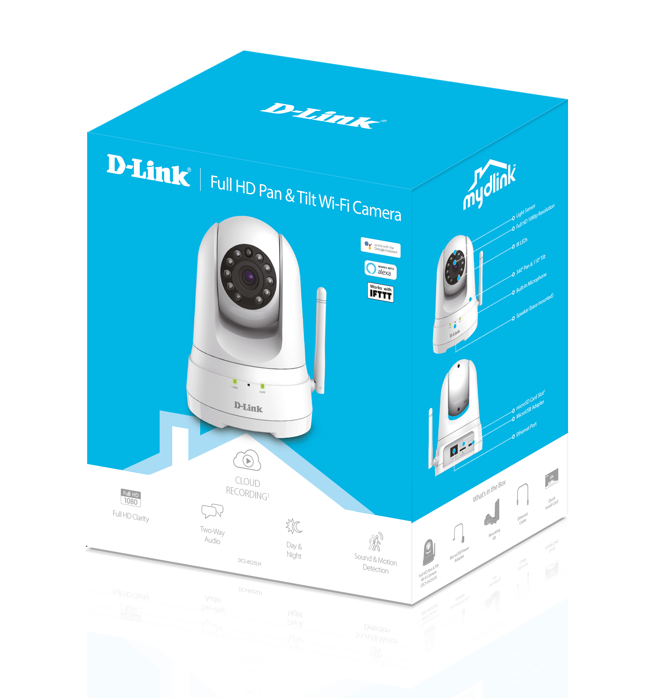 mydlink Automation Cloud Recording MicroSD Card slot Die Sprachsteuerung funktioniert mit Amazon Alexa oder Google Assistant. Geofencing |
