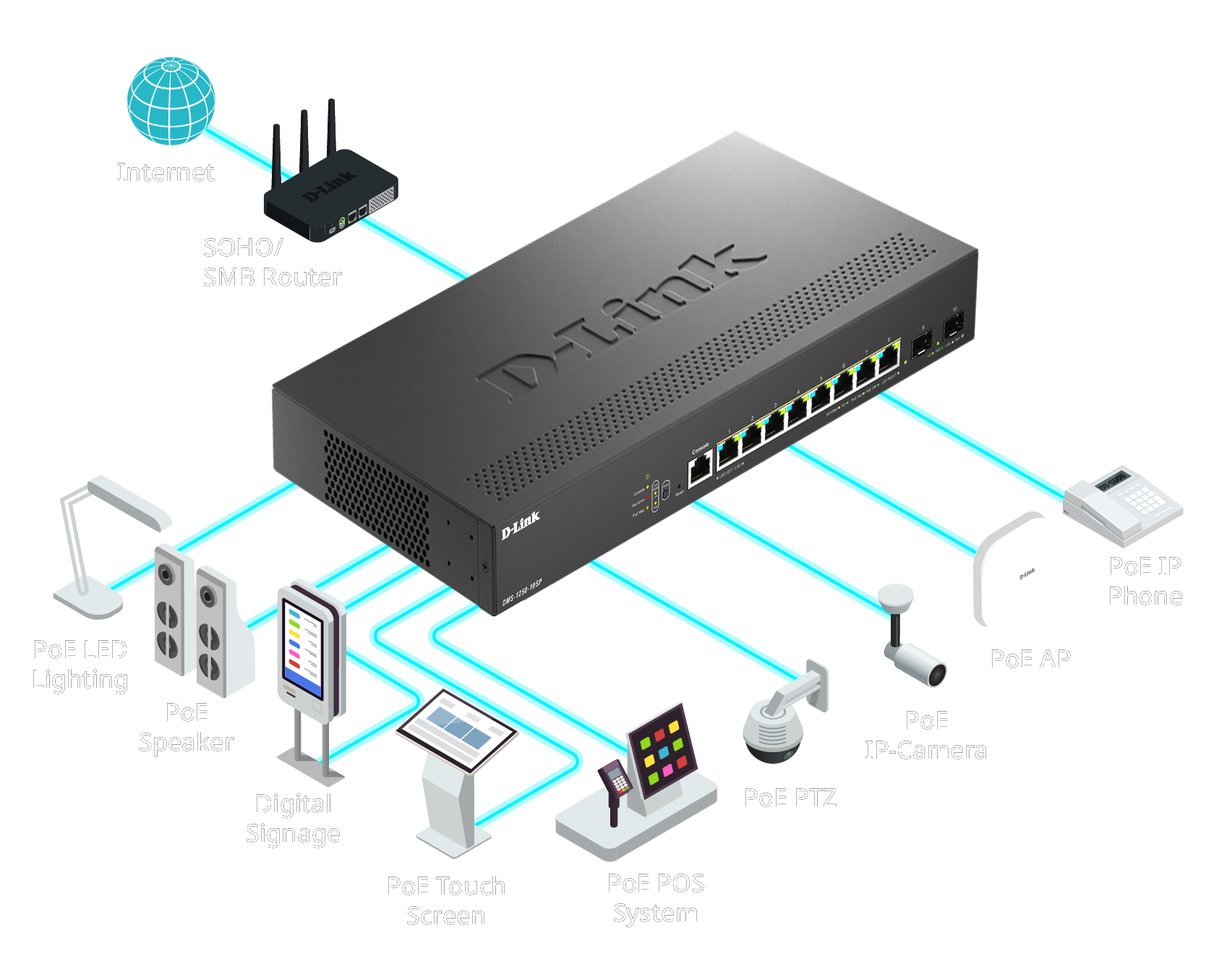 Die Switches der DMS-1250 Serie sind vielseitig einsetzbar und eignen sich für SOHO-, SMB- und MDU-Umgebungen. Sie bieten mit 2,5 GB eine Datenübertragung in Hochgeschwindigkeit und für externe Konnektivität eine essenzielle Uplink-Geschwindigkeit von 10 GB. Diese hohe Uplink-Geschwindigkeit stellt sicher, dass die gesamte MDU ohne Datenengpässe auf externe Dienste zugreifen kann. Darüber hinaus sind in den Modellen DMS-1250-10SP, 10SPL und 12TP die Standards IEEE 802.3at oder IEEE 802.3bt implementiert.