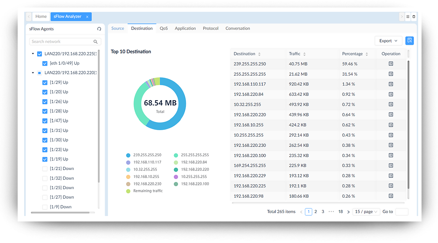 Mit dem Upgrade auf die Enterprise Edition von D-View 8 erhalten Sie Zugriff auf sFlow zur Erstellung von Berichten über Netzwerkdatentrends auf Basis der Herkunft oder des Ziels von Paketen, QoS-Regeln, Layer-4-Anwendungen und Kommunikation zwischen zwei Knoten.