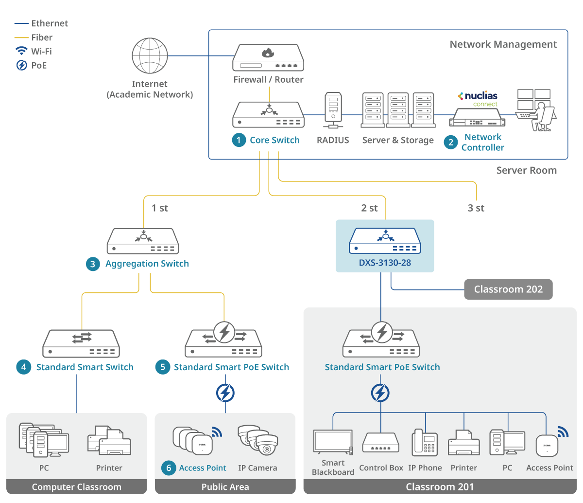 - VLAN und QoS optimieren den Datenverkehr für bessere Lernerfahrungen.