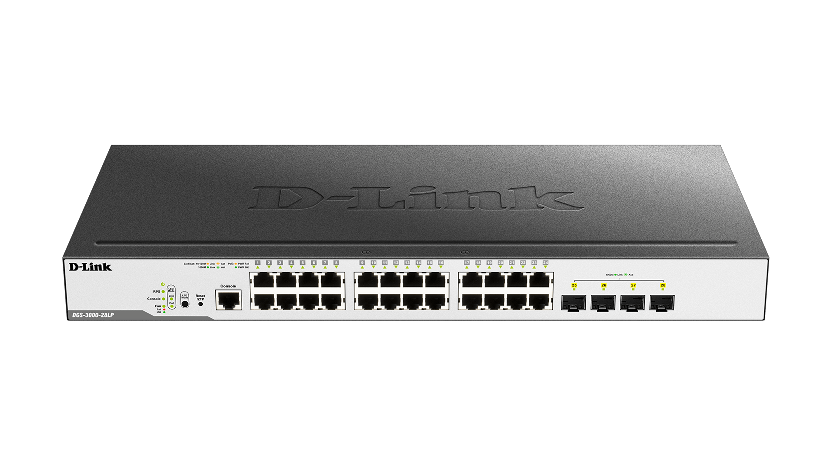 The DGS-3000-28LP switch features Power over Ethernet (PoE), and switching capacities of 56 Gbps.