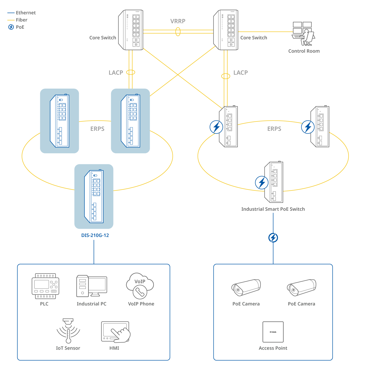 The DIS-210G-12 is an industrial smart switch equipped with eight 1G ports and four 1G SFP ports for network management and aggregation. The SFP ports support long-distance data transmission, rapid failover redundancy, and throughput aggregation. The DIS-210G-12 supports ERPS and static routing, which reduces latency, enables effective traffic control, and improves network scalability and efficiency.