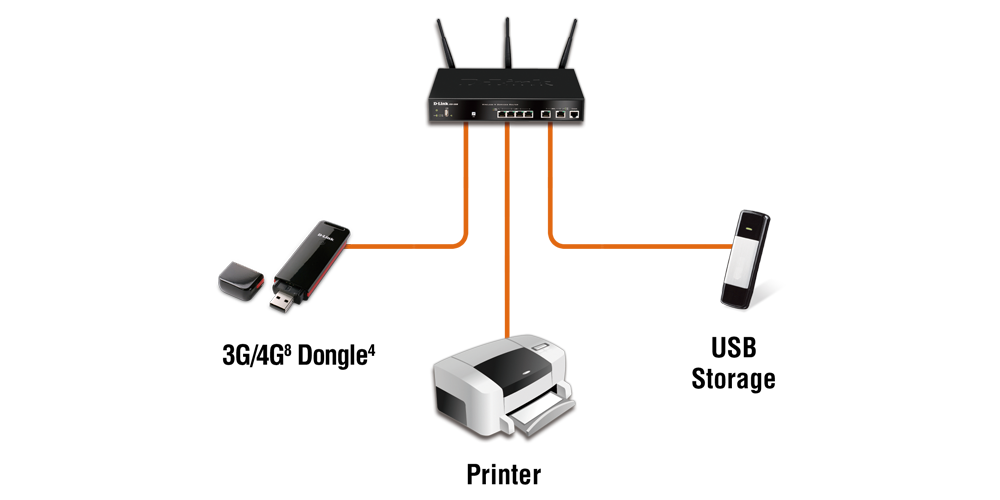 The DSR-1000AC includes dual WAN Gigabit Ethernet ports to provide high availability for your WAN or Internet connections. Traffic can be load-balanced across the links with Outbound Load Balancing, increasing the performance and availability of business applications. It supports mobile broadband networks via an optional USB modem1, such as 3G or 4G dongles.