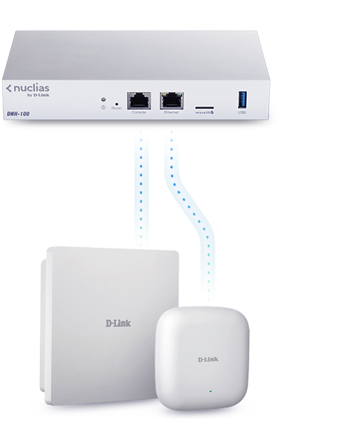 The DNH-100 Wireless Controller provides an inexpensive, ready-made solution, and removes the need for installing and maintaining Nuclias Connect on additional hardware such as a server or PC. It supports up to 100 APs, automatically detects devices, pushes configurations, and provides robust hardware management. Simply plug in and power on.