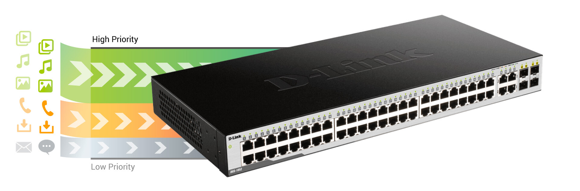 Your new switch is an intelligent piece of kit. The Quality of Service (QoS) feature intelligently organizes traffic based on time-sensitivity. At peak times, video conference calls or video streaming can really hit a snag. QoS knows what is important and pushes it to the front of the line. No more dropped calls or video buffering.