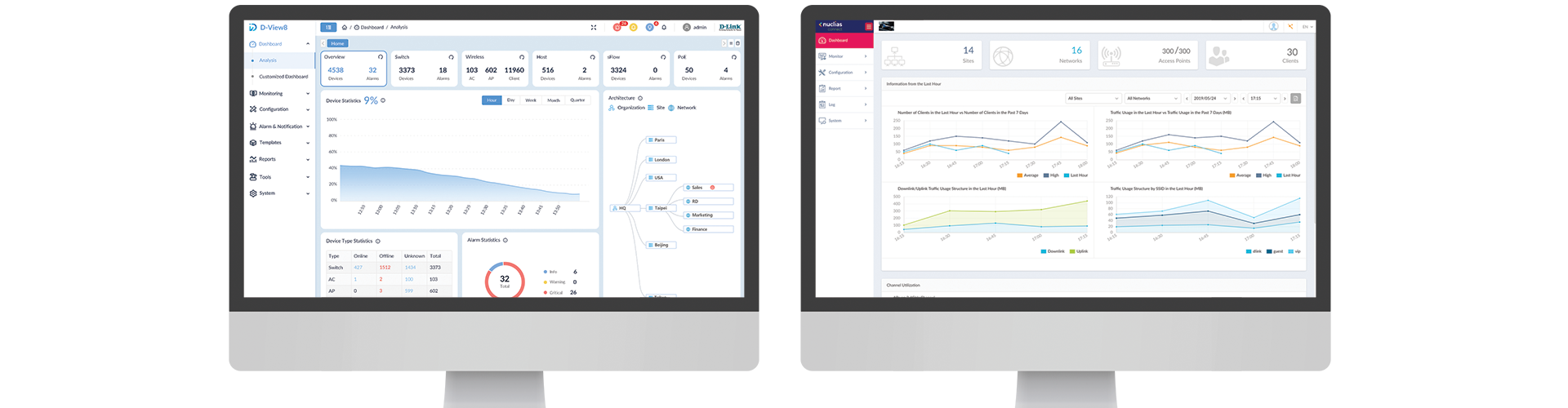 The DMS-1250 Series switches offers a range of management tools to cater to users' diverse needs. D-Link Nuclias Controller (DNC) and D-Link Nuclias Hub (DNH) enable the discovery and management of multiple D-Link devices, providing access to configure settings efficiently. Furthermore, the DMS-1250 Series can be seamlessly managed through D-View 8, a comprehensive central network management system. SNMP functionality allows for centralized network asset management, remote configuration, and logging functions.