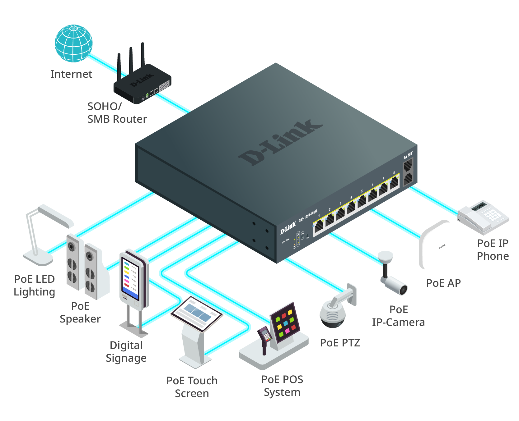 The DMS-1250 Series switches are versatile, suitable for SOHO, SMB, and MDU environments. They provide high-speed data transmission with 2.5GE and a crucial 10G speed uplink for external connectivity. This high-speed uplink ensures that the entire MDU can access external services without encountering data bottlenecks.Furthermore, they effectively implement IEEE 802.3at or IEEE 802.3bt in DMS-1250-10SP, 10SPL, and 12TP to enable devices to connect and receive power supply.