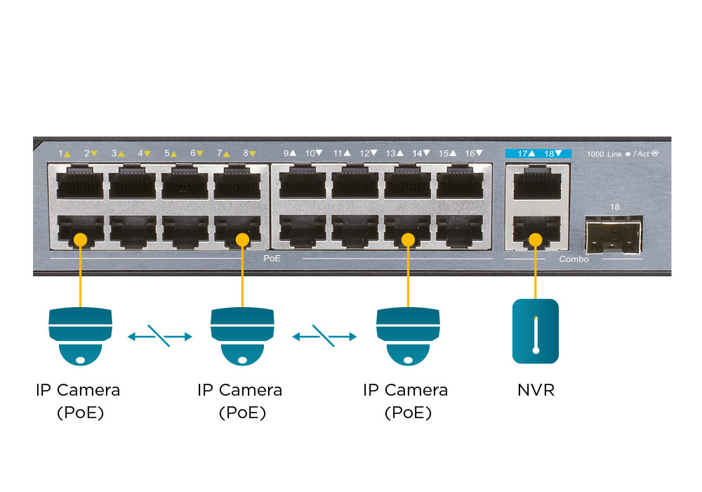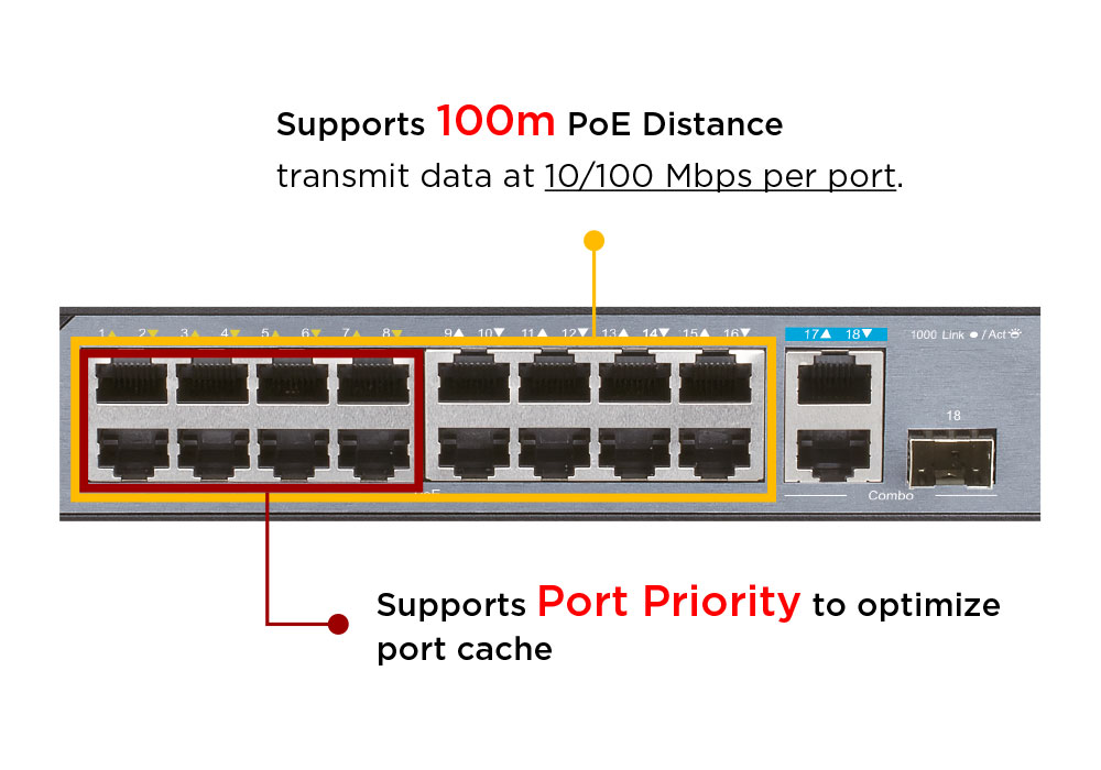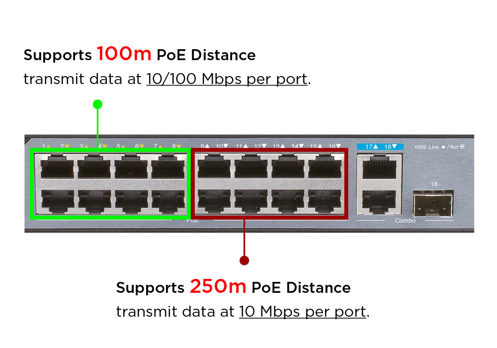 The DSS-100E-18P has a total PoE power budget of 230W, with up to 30W on each port meaning it’s ready to power your PoE-ready cameras and other devices. Simply connect your PoE supported devices and you’ve got a capable surveillance network with minimal wiring required. Meanwhile, it has an extended PoE range of 250m, reaching devices further than before. Finally, its Gigabit uplink provides ample bandwidth. This ensures smooth transmission of footage when connecting to Network Video Recorder (NVR) or core switch.