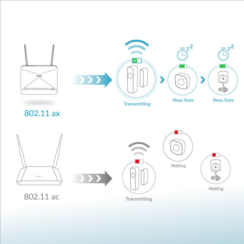 Target Wake Time (TWT) technology schedules connected devices to be awake or asleep during designated time periods. This not only saves device battery life, but also reduces network congestion.