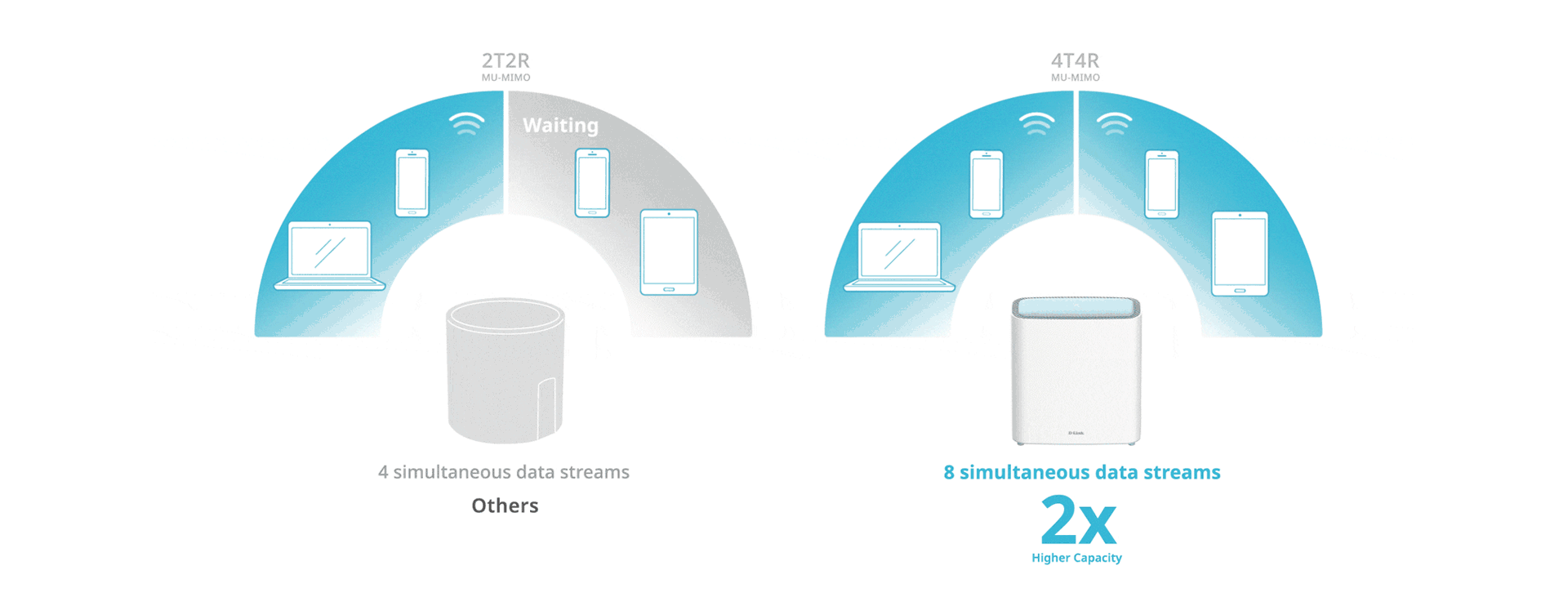 Wi-Fi 6 features bi-directional MU-MIMO technology to handle more simultaneous users at faster data rates, and beamforming capability to greatly extend Wi-Fi coverage area.