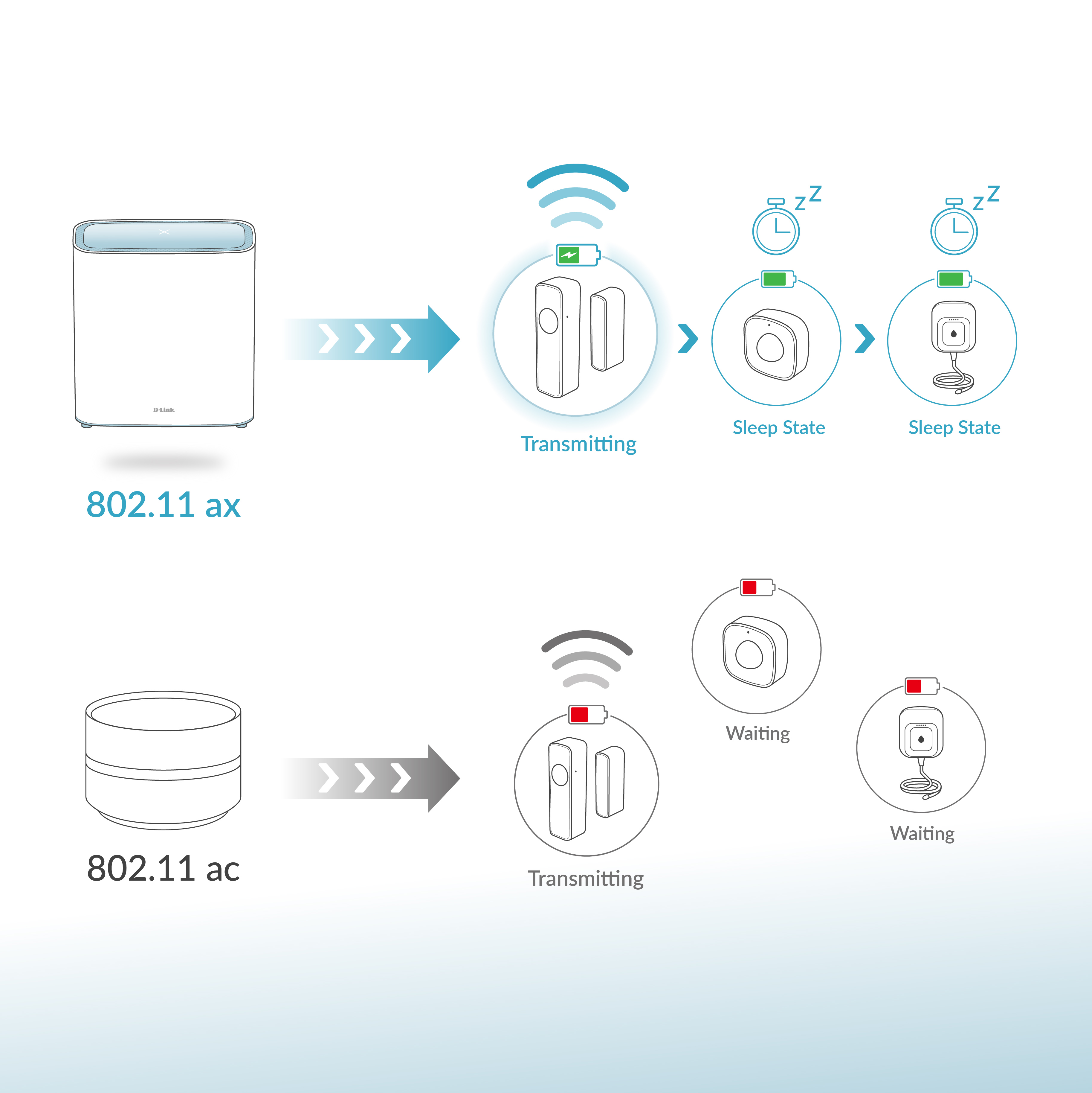 Target Wake Time (TWT) technology schedules connected devices to be awake or asleep during designated time periods. This not only saves device battery life, but also reduces network congestion.