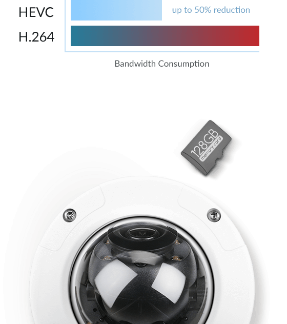 Para maximizar la eficiencia de ancho de banda y mejorar la calidad de la imagen, DCS-4605EV utiliza los códecs H.265, H.264 y MJPEG, y admite tres perfiles separados para la transmisión de vídeo y grabación simultánea.