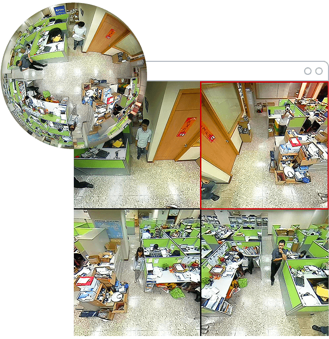 La lente panorámica gran angular consigue la cobertura más amplia posible con un vídeo de 360°. La tecnología de desdoblamiento integrada le ofrece la opción de visualizar en cuatro vistas parciales o dos panorámicas. Cubra todas las esquinas con una sola cámara.