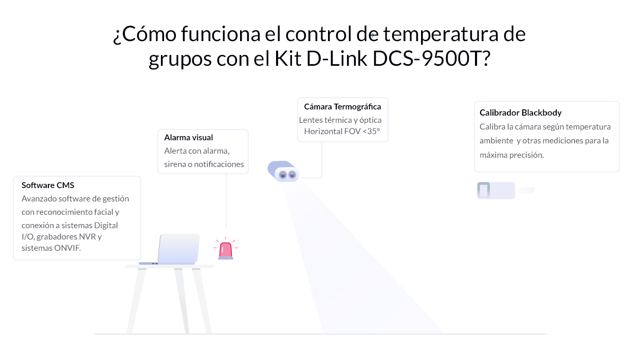 El kit todo en uno de detección de fiebre DCS-9500T tiene todo lo necesario para empezar a medir la temperatura de grupos de personas simultáneamente con precisión. Incluye la cámara termográfica, el calibrador Blackbody, dos soportes de montaje en pared y software de gestión libre con funciones de IA. No requiere instalación adicional de hardware ni de software.